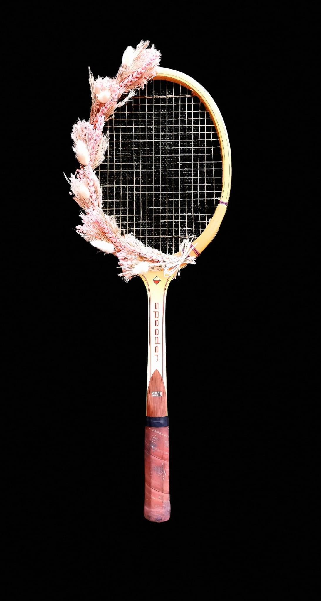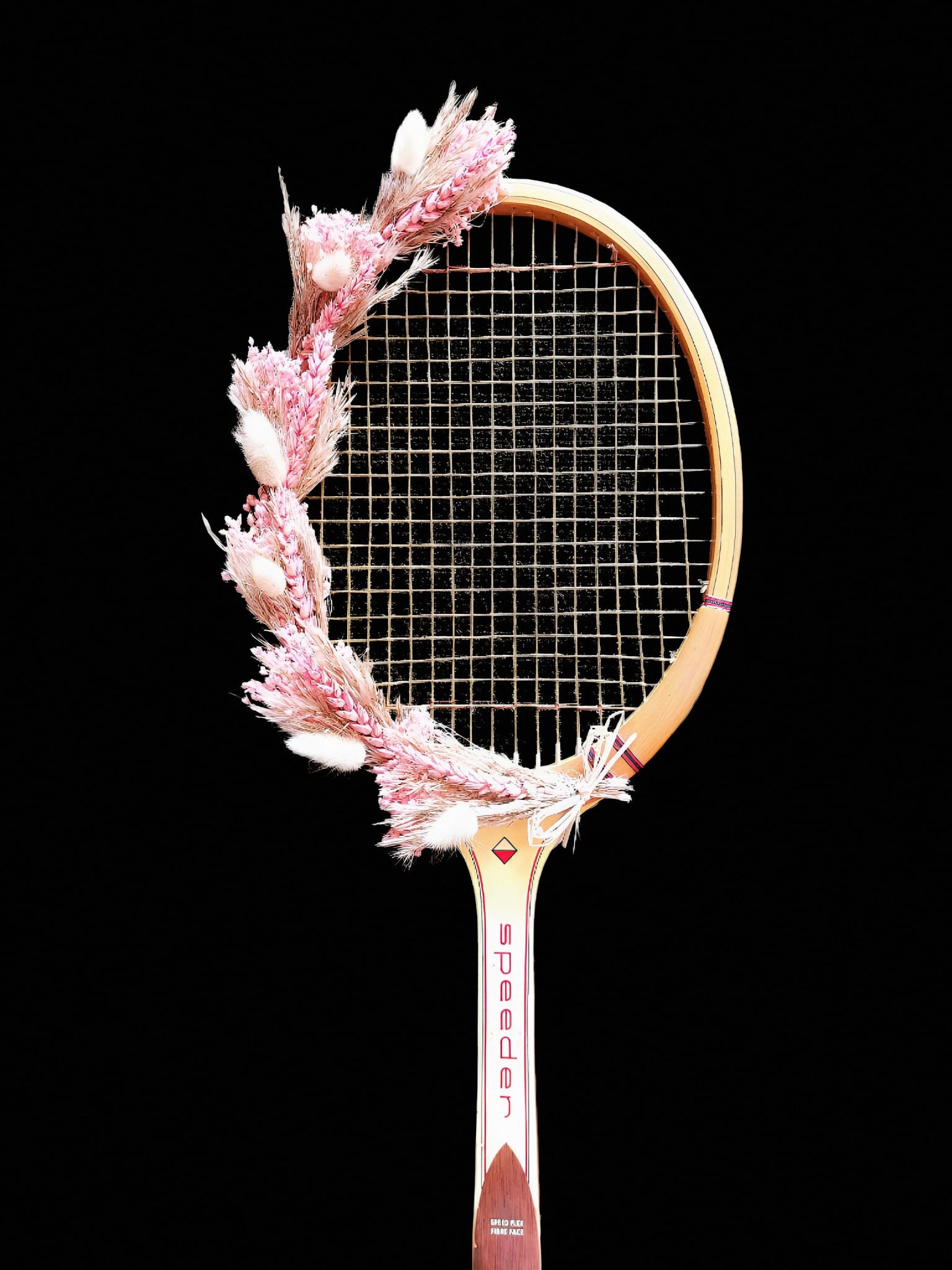 Couronne de fleurs séchées sur le tamis de la raquette.