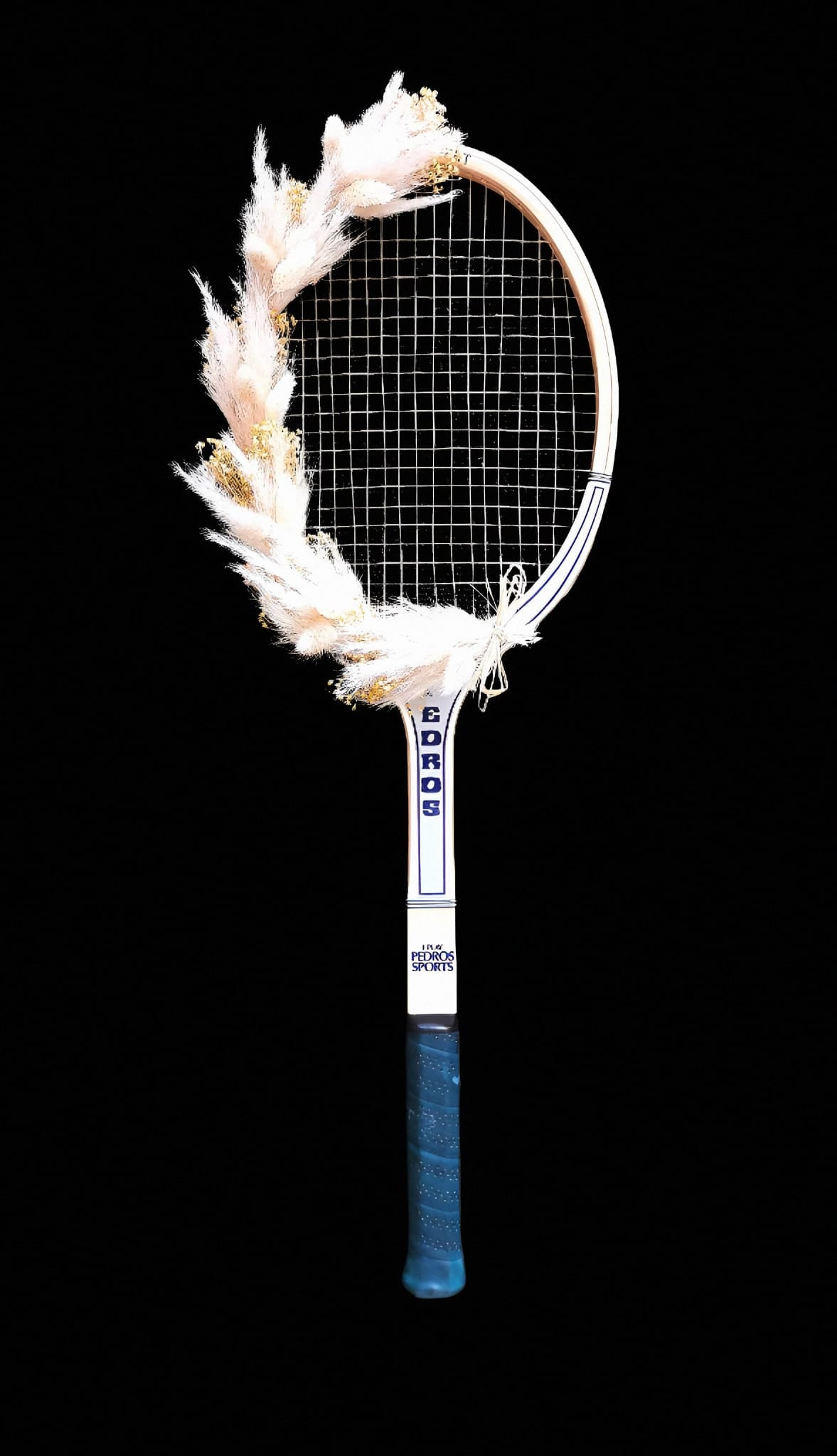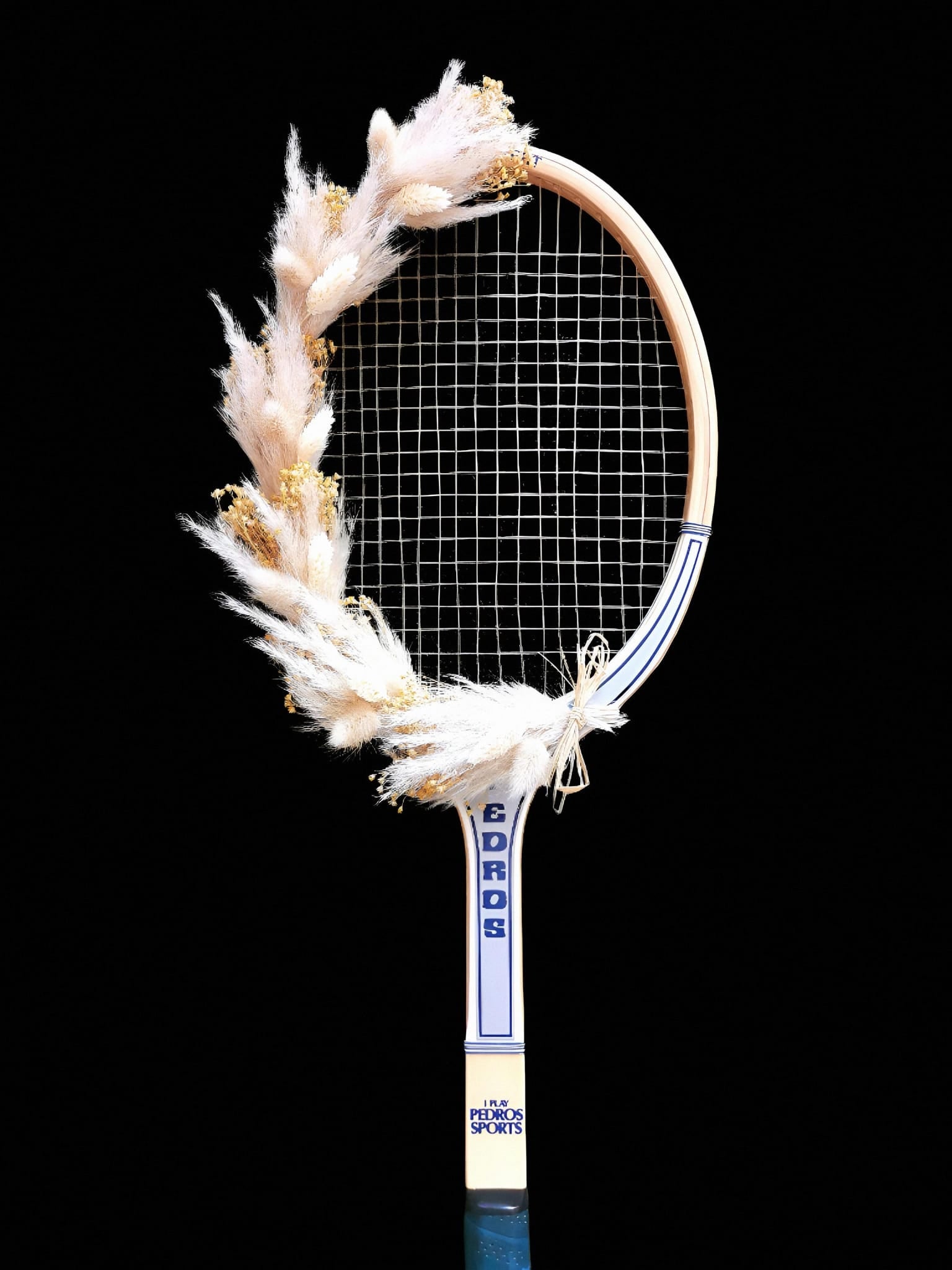Couronne de fleurs séchées sur le tamis de la raquette.